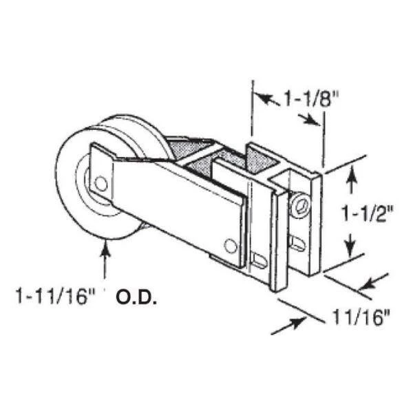This sliding glass door roller features an extruded aluminum outer housing and inner housing. This assembly has a 1-11/16 in. nylon wheel for smooth operation. Used by Plaza Doors and other manufacturers.