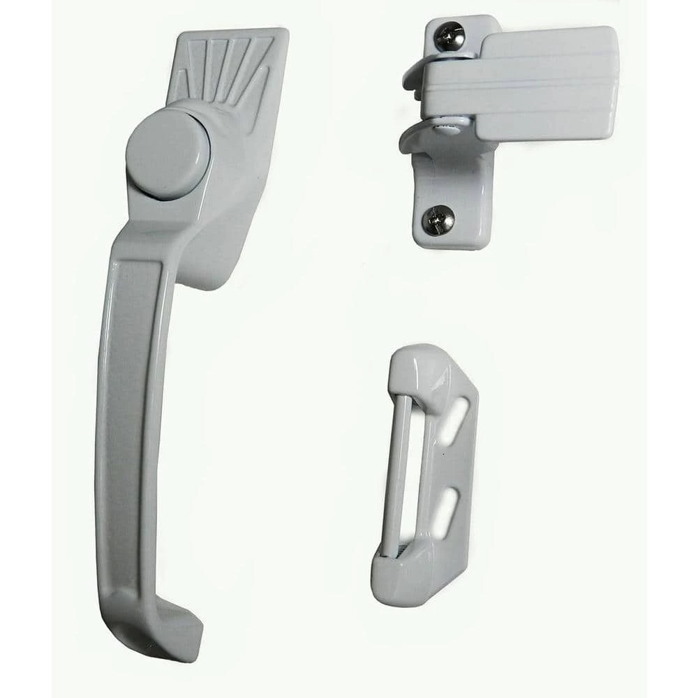 This push bottom handle set is the most popular style for out-swinging doors and is used by many screen patio manufacturers. Constructed of all aluminum and stainless steel components for a long lasting, rust free life. Features a white finish to match most any decor.