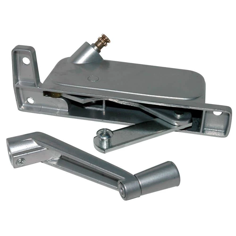 This left-hand awning window operator is used by Tucker Aluminum Products. Finished in silver color. Aluminum and die cast construction.