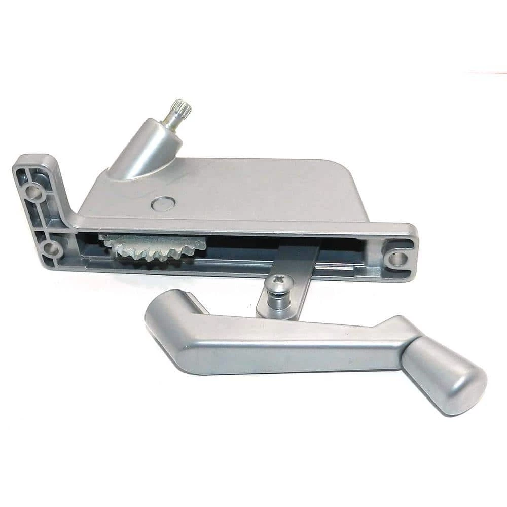 This left-hand awning window operator is made of aluminum and zinc die cast. Finished in silver color to match the window frames. Fits awning type windows manufactured by TM Windows and Doors.