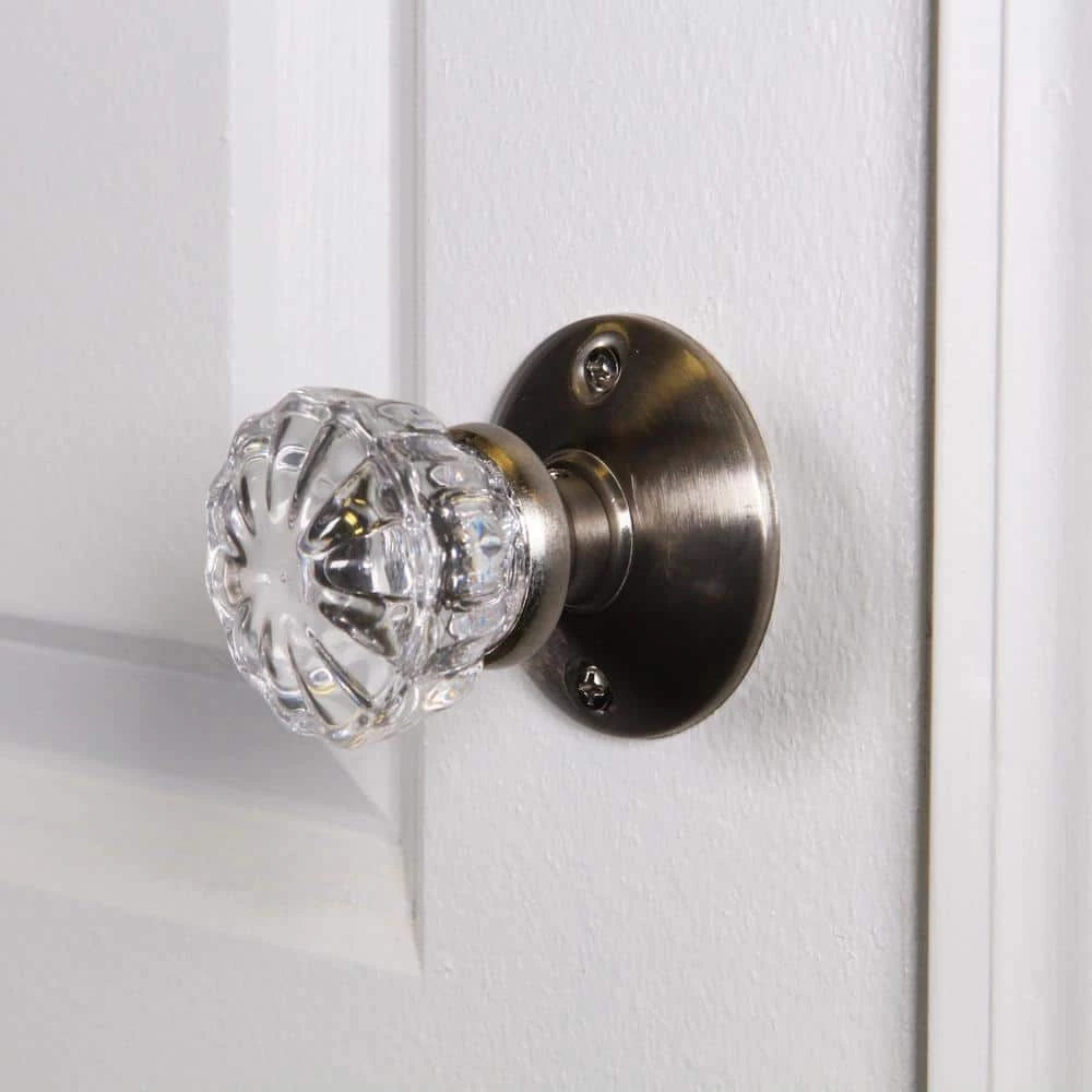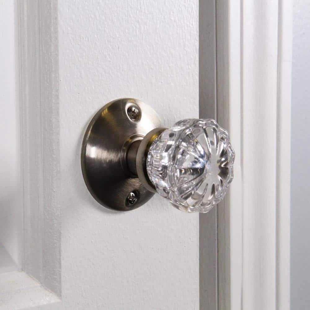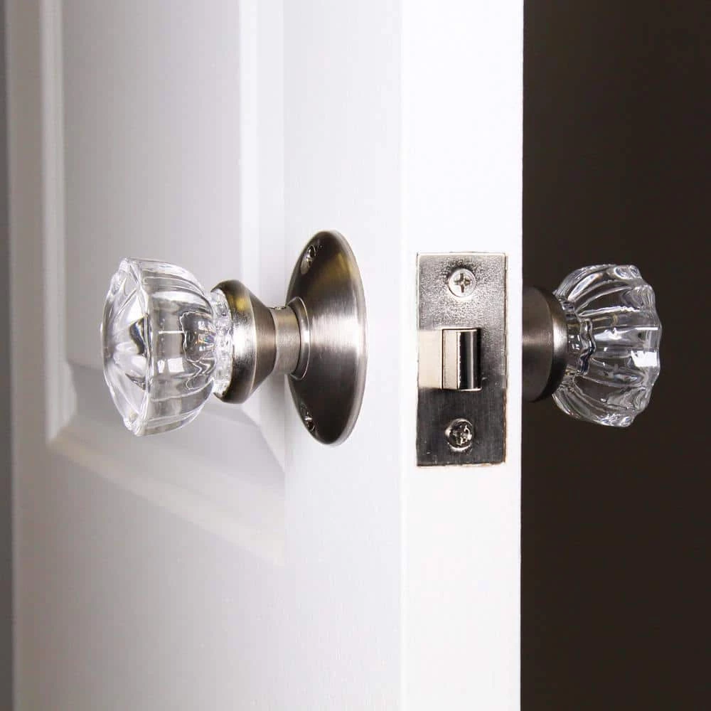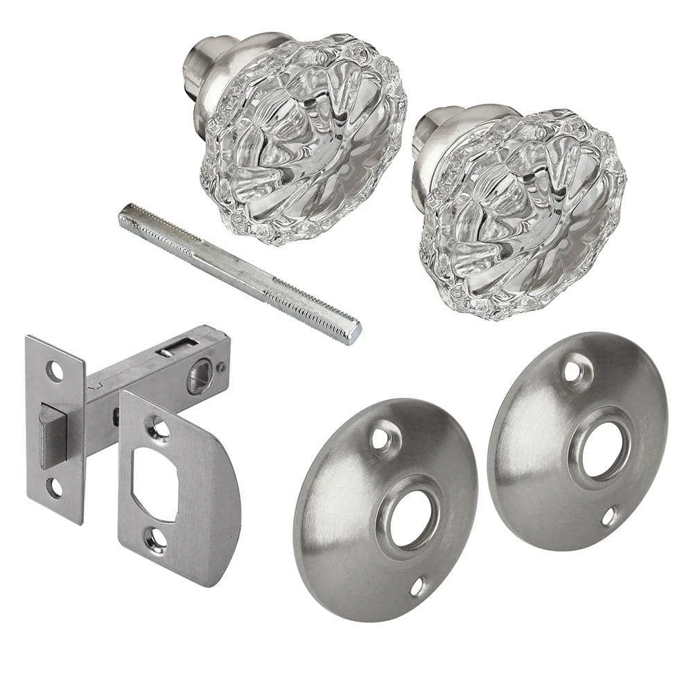 The Defiant 2 in. Satin Brass Glass Knob Passage Set is constructed from steel. Includes (2) 2 in. Glass Knob, (2) Back Plates, (1) Strike Plate, (1) Latch Plate and (1) Spindle. Easy to install with included fasteners.