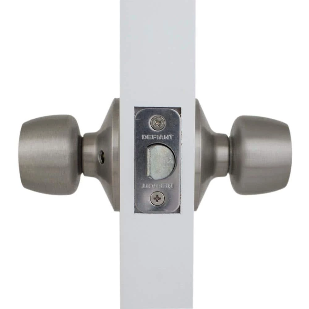 Affordably outfit latching interior doors with this Brandywine Passage knob set from Defiant. The new design feature of a 70 mm Rose Plate conveniently covers paint rings left from old door hardware removal. This unit easily mounts to doors 1-3/8 in. to 1-3/4 in. thick with the included hardware, perfect for residential doorways where locking is not needed. It also features the EZ Fit backset and interchangeable faceplates for drive-in and traditional installations. The sturdy door knob nicely coordinates with other plumbing and lighting fixtures in your home for a cohesive look. A lifetime warranty ensures the durability of this device for long-term use.