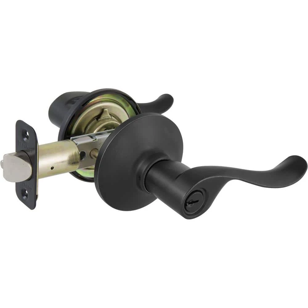 Defiant Burgundy Keyed Entry Door Lever features a Matte black finish, radius latch with an Easy Fit backset and optional drive-in feature. It can be re-keyed to match your existing KW1 keyway. It is also backed by a limited lifetime guarantee and protected with a powder-coated finish that will provide years of durability.