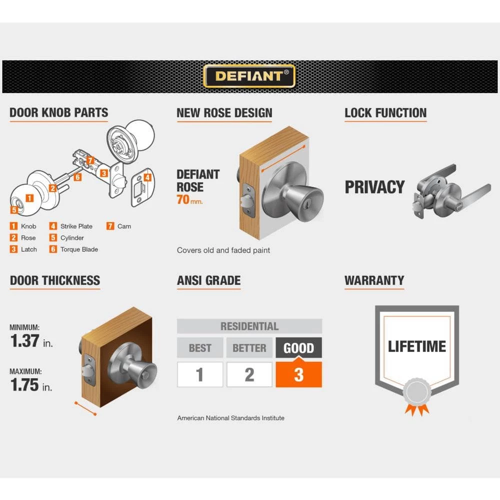 Defiant Kensington Privacy Door Lever features a powder coated finish that will provide years of beauty. The radius latch comes with an adjustable backset and optional drive-in feature. It is also backed by a Limited lifetime guarantee that will ensure years of durability.