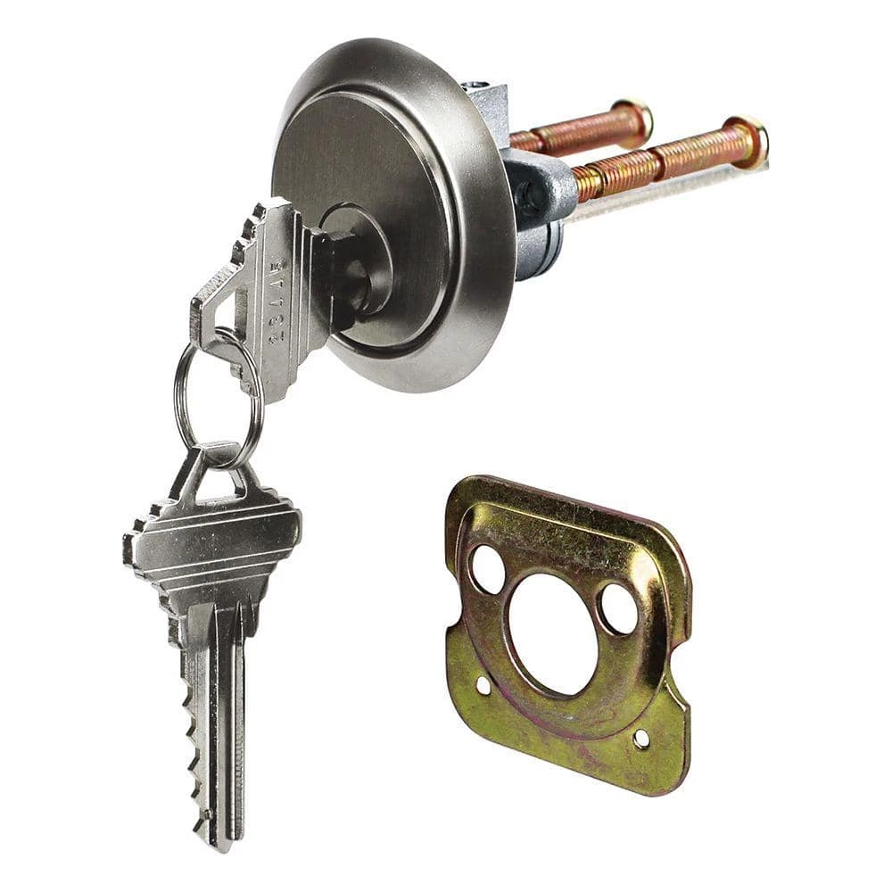 The Defender Schlage Rim Cylinder is constructed from solid brass and comes in a satin nickel finish. It includes a trim ring, mounting plate, screws and 2 keys. Easy to install with included fasteners.